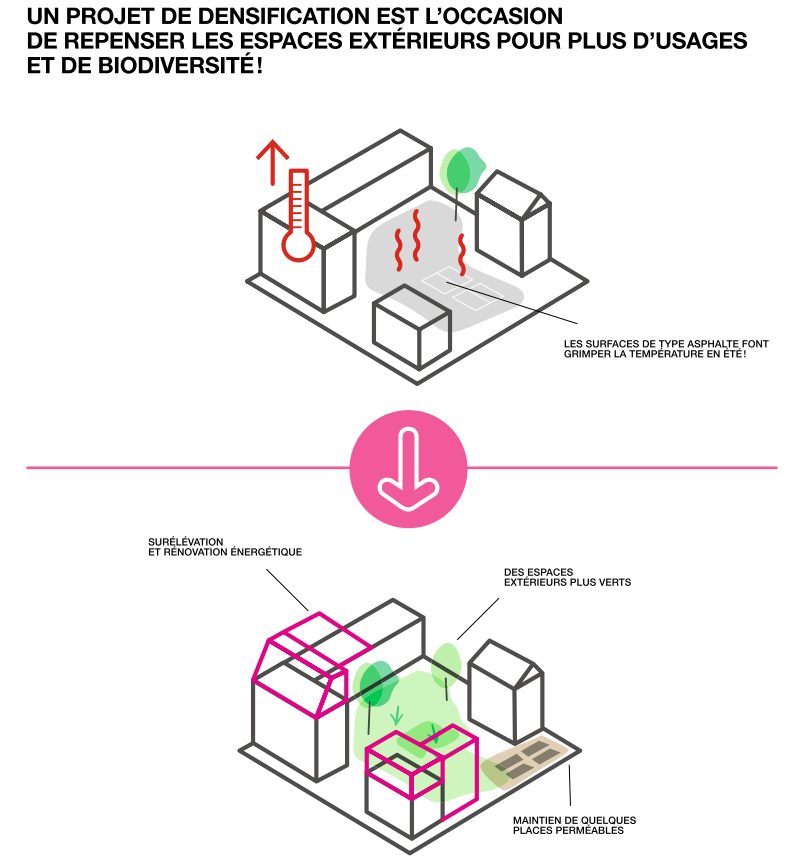 le traitement des espaces extérieurs : augmenter le nombre d’arbres pour un effet régulateur sur les températures, augmenter les surfaces favorables à la biodiversité et les surfaces perméables ;