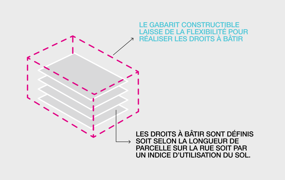 La constructibilité correspond à la surface maximale qu’un∙e propriétaire peut construire sur sa parcelle. Afin de favoriser la diversité architecturale qui constitue l’une des qualités d’un quartier comme Plan-Dessous, il est important que le gabarit constructible permette de réaliser ces surfaces de différentes façons. Aussi, les règles de hauteur, profondeur et largeur des bâtiments laissent de la marge par rapport à la constructibilité afin que plusieurs solutions architecturales soient possibles. Ce gabarit est une enveloppe dans laquelle il s’agit de répartir les surfaces constructibles maximales définies.