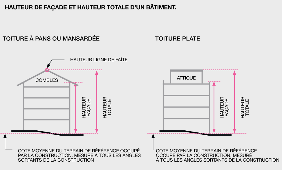 Pour les quartiers qui ont des caractéristiques morphologiques particulières comme les îlots, la constructibilité est calculée selon la longueur de la parcelle sur la rue, appelée « front ». Il faut alors multiplier la longueur du front par une profondeur moyenne (12 ou 14 m) et un nombre de niveaux (par exemple 4 niveaux + attique ou comble).