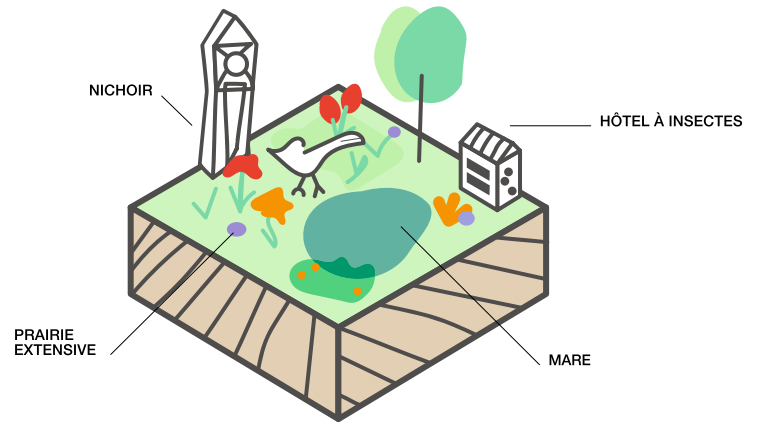 Au sein des surfaces végétalisées, les surfaces refuges pour la biodiversité sont conçues et entretenues de manière à offrir un habitat favorable à la biodiversité. Il s’agit par exemple de prairies fleuries, de haies vives, de surfaces plantées d’arbres fruitiers haute tige, d’étangs, de mares ou surfaces accueillant des installations telles que gîtes et nichoirs à faune. À la différence des surfaces végétalisées, ces surfaces sont destinées en priorité à la biodiversité plus qu’à l’usage des habitant∙e∙s. Pour ces surfaces, le règlement fixe également un objectif minimum.