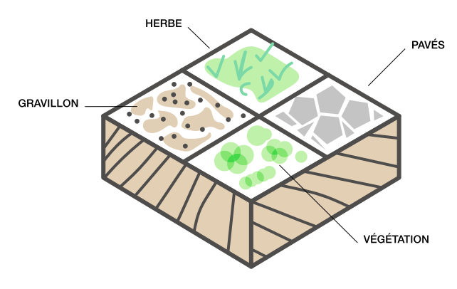 Dans le règlement, les différentes zones ont un objectif de surface de pleine terre minimum proportionnel à la taille des espaces extérieurs de la parcelle. Cet objectif est élevé car aujourd’hui il existe de multiples alternatives au béton et à l’asphalte : pavé enherbé, stabilisé ou encore gravier. Les surfaces végétalisées de la parcelle comptent bien entendu dans les surfaces de pleine terre.