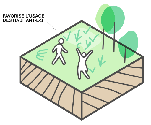 Elles sont également des espaces privilégiés pour le délassement des habitant∙e∙s. De la même manière que pour les surfaces de pleine terre, les différentes zones ont un objectif de surfaces végétalisées minimum.