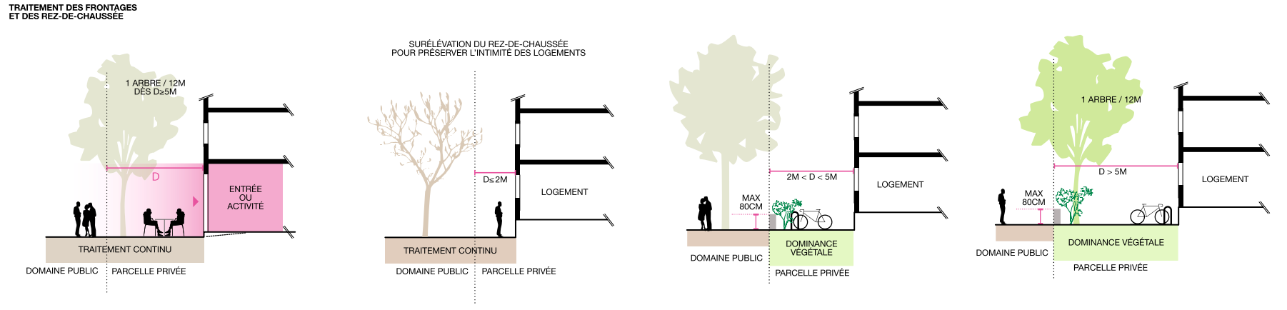 Pour les rez-de-chaussée dédiés au logement, des règles sont également données afin d’assurer un bon équilibre entre besoin d’intimité pour les habitant∙e∙s et qualités d’ouverture à l’espace public. Ces règles dépendent également de la distance qu’il y a entre la façade du bâtiment et le domaine public. Plus la distance est grande, plus les objectifs de végétation sont grands, et vont même jusqu’à l’obligation de planter des arbres entre la façade du bâtiment et le trottoir, ce qui permet de compenser sur les parcelles privées le fait que certaines rues sont trop étroites ou qu’il y a trop de réseaux souterrains pour pouvoir y planter des arbres.