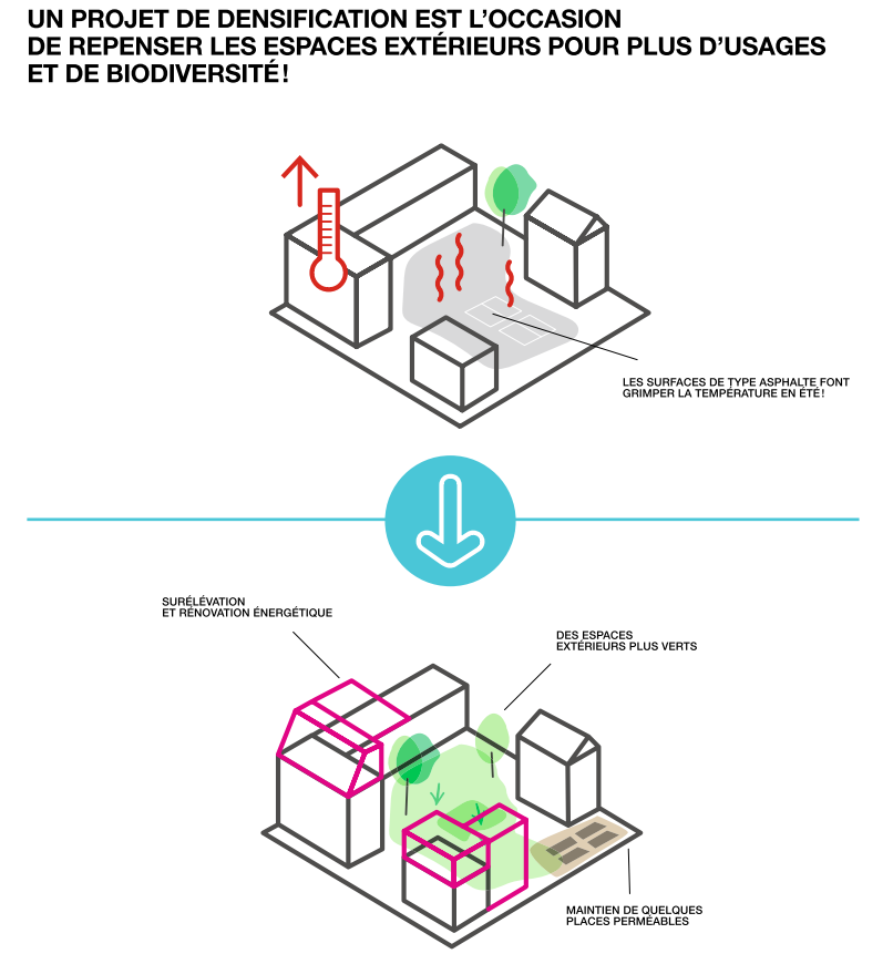 le traitement des espaces extérieurs : augmenter le nombre d’arbres pour un effet régulateur sur les températures, augmenter les surfaces favorables à la biodiversité et les surfaces perméables ;